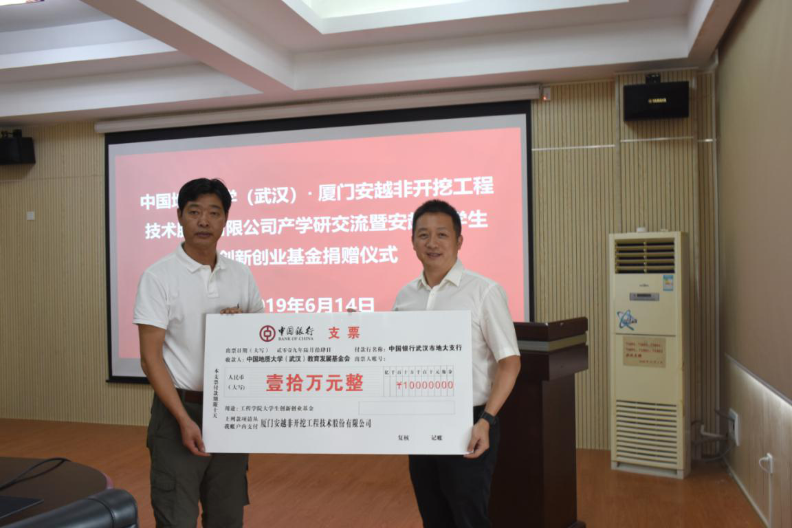 2019年6月14日上午,厦门安越非开挖技术股份有限公司来校作产学研交流,并捐赠10万设立安越老员工创新创业基金,捐赠仪式在315举行。厦门安越非开挖技术股份有限公司董事长廖宝勇一行、武汉中地大非开挖研究院有限公司总经理孔耀祖,员工工作与教育基金管理处副处长吕占峰、丁苗苗,工程公司党委书记陈飞、党委副书记江广长、副教授曾聪参加会议。江广长主持会议。