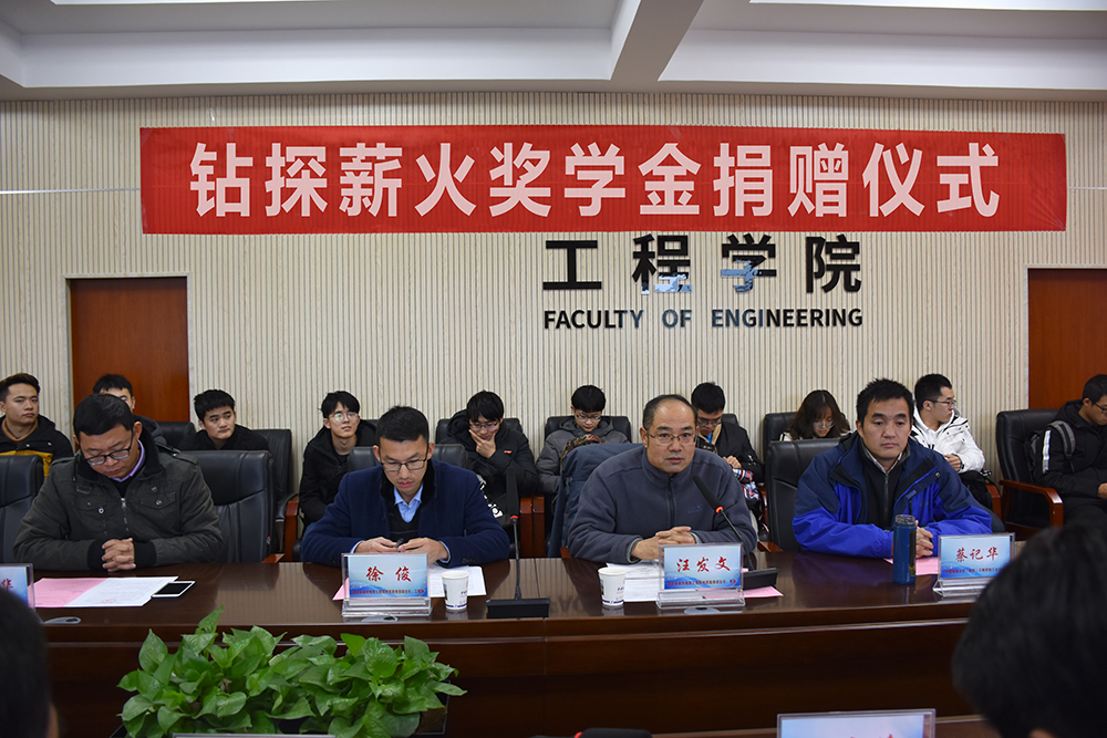 陈飞致辞,他首先向员工汪发文、徐俊及betway西汉姆联平台蒋国盛、蔡记华、卢春华等几位老师对公司工作和钻探专业的关心与支持表达了谢意。他说,此次捐赠资金来源于校企合作的成果奖励,希望双方今后发挥各自优势加深加强合作,促进科技成果转化;通过设立此次奖学金,更加激励同学们学好专业知识,树立专业自信,为将来投身工程行业,服务国家建设做好准备。