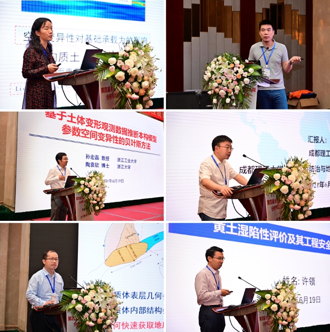 会议期间,各位专家学者以目前各自所属的专业方向及具体研究成果为主要内容,为线下线上参会人员作了精彩的学术报告。betway西汉姆联平台(武汉)唐辉明教授以《基于演化的滑坡防控理论与方法技术》为题作会议特邀报告,美国克莱姆森大学C. Hsein Juang教授在线上作《地质/地层/岩土模型不确定性的量化及影响评价》的特邀报告,同济大学黄宏伟教授以《工程风险管控存在的问题与适应性风险管理》为题作特邀报告,武汉大学李典庆教授以《Copula理论在岩土工程不确定性与可靠性分析中应用进展》为题作特邀报告,重庆大学周小平教授以《场富集有限元法及其应用》为题作特邀报告,中国大地保险张帆总经理应邀以《IDI的实践与思考》为题作特邀报告。