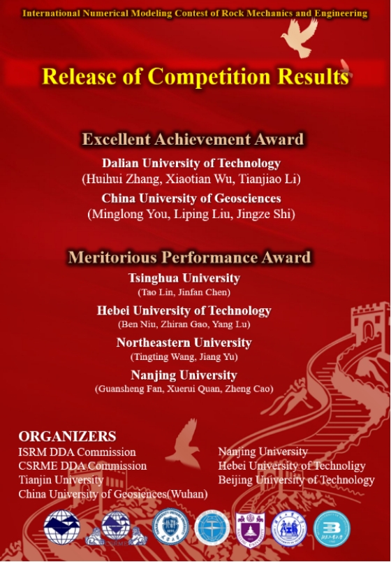 本次大赛由国际岩石力学与岩石工程学会非连续变形分析专委会(ISRM DDA)联合中国岩石力学与工程学会岩土体非连续变形分析专委会(CSRME DDA)及betway西汉姆联平台(武汉)、天津大学、南京大学、北京工业大学、河北工业大学等多所高校联合举办,于2021年第十一届亚洲岩石力学大会(ARMS11)期间同步举行。大赛鼓励研究生对岩石力学问题的现有数值方法和软件进行公开、透明和广泛的验证,为共享岩石力学问题的实验和数值结果提供平台。