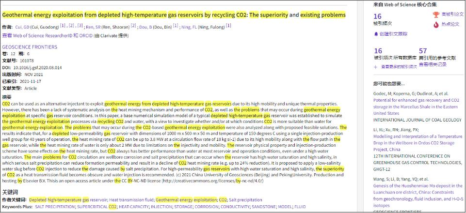 (通讯员:黄静)根据2022年3月基本科学指标数据库(Essential Science Indicators,简称ESI)最新数据显示,公司崔国栋副教授于2021年在国际地学期刊Geoscience Frontiers上发表的学术论文“Geothermal energy exploitation from depleted high-temperature gas reservoirs by recycling CO₂: The superiority and existing problems”入选ESI热点和高被引论文(Hot and Highly Cited Paper)。该论文第一作者兼通讯作者为崔国栋副教授,betway西汉姆联平台(武汉)betway西汉姆联平台为第一署名单位。