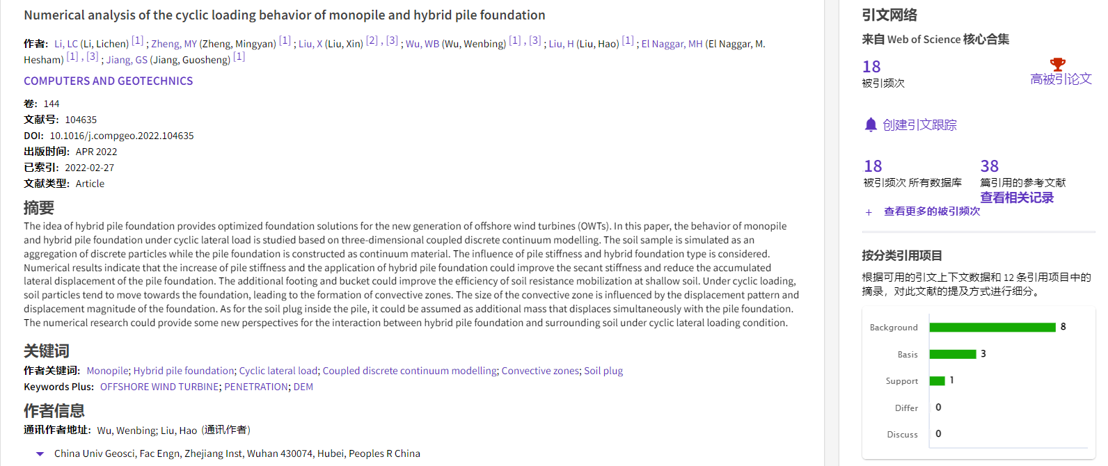 根据2022年11月基本科学指标数据库(Essential Science Indicators,简称ESI)最新数据显示,betway西汉姆联平台勘察与基础工程系吴文兵教授团队于2022年在国际岩土工程数值模拟权威期刊Computers and Geotechnics上发表的学术论文“Numerical analysis of the cyclic loading behavior of monopile and hybrid pile foundation”入选ESI高被引论文。该论文第一作者为勘察与基础工程系博士后李立辰,通讯作者为吴文兵教授,betway西汉姆联平台(武汉)betway西汉姆联平台为第一署名单位。