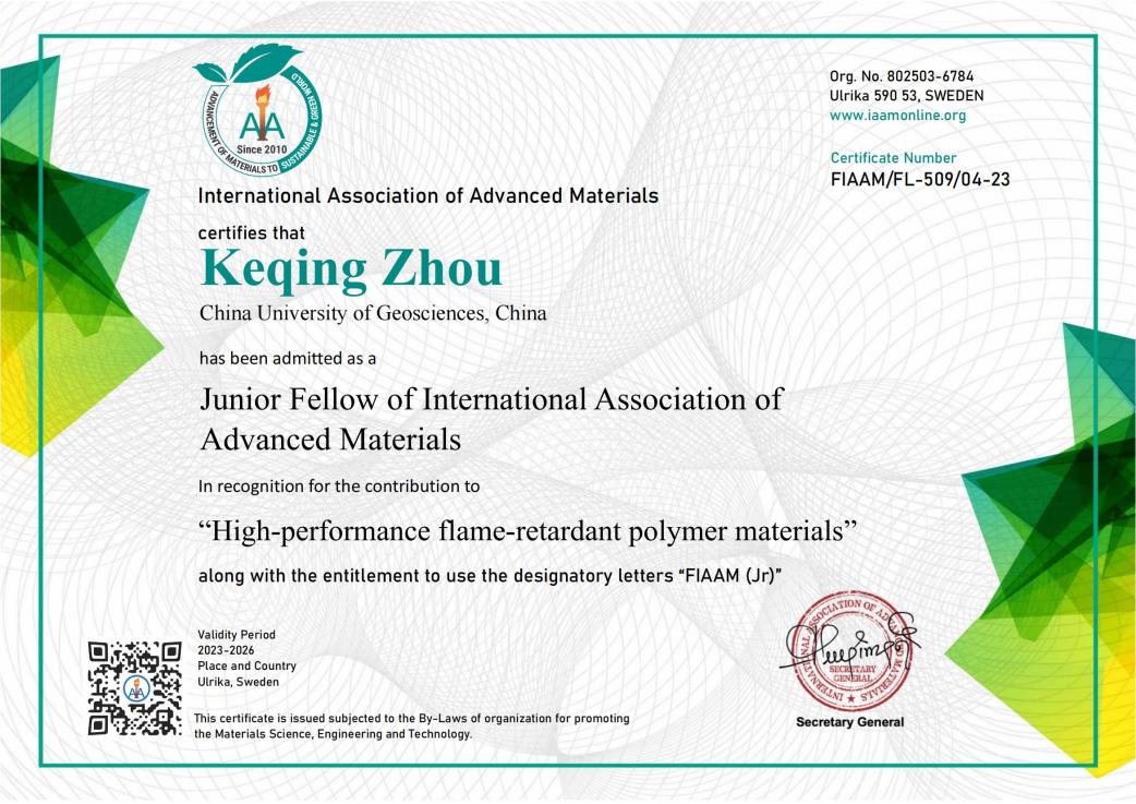 (通讯员 黄静)近日,betway西汉姆联平台(武汉)betway西汉姆联平台周克清特任教授收到国际先进材料学会(International Association of Advanced Materials, IAAM)执委会发来的贺函,祝贺他当选为国际先进材料学会青年会士(Junior Fellow of IAAM, FIAAM)。周克清特任教授受邀在美国奥兰多举办的复合材料研讨会(Composite Materials Congress)上发表题为“Functionalized 2D molybdenum disulphide working on high-performance flame-retardant polymer materials”的IAAM Fellow演讲,会上获颁青年会士“Junior Fellow”证书,以表彰他在“高性能阻燃聚合物材料”领域做出的杰出贡献。