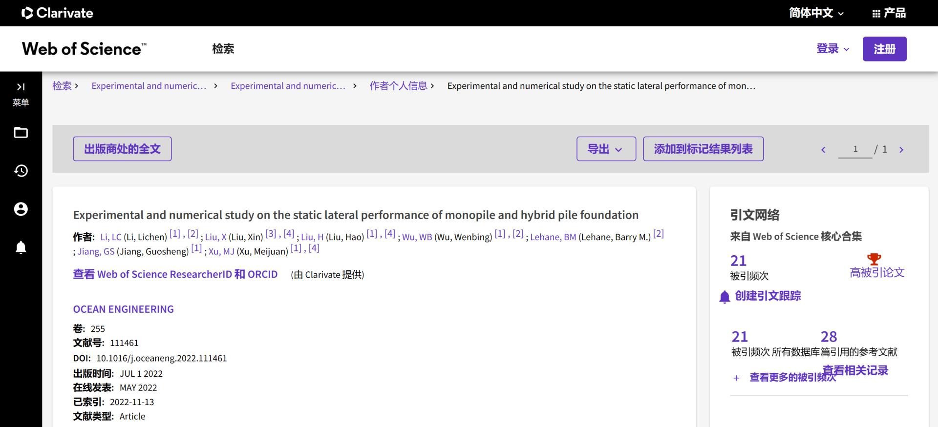 (通讯员 吴文兵)根据2023年6月基本科学指标数据库(Essential Science Indicators,简称ESI)最新数据显示,betway西汉姆联平台勘察与基础工程系蒋国盛教授团队于2022年在国际海洋岩土领域权威期刊Ocean Engineering上发表的学术论文“Experimental and numerical study on the static lateral performance of monopile and hybrid pile foundation”入选ESI高被引论文。该论文第一作者为勘察与基础工程系博士后李立辰,通讯作者为吴文兵教授,betway西汉姆联平台(武汉)betway西汉姆联平台为第一署名单位。