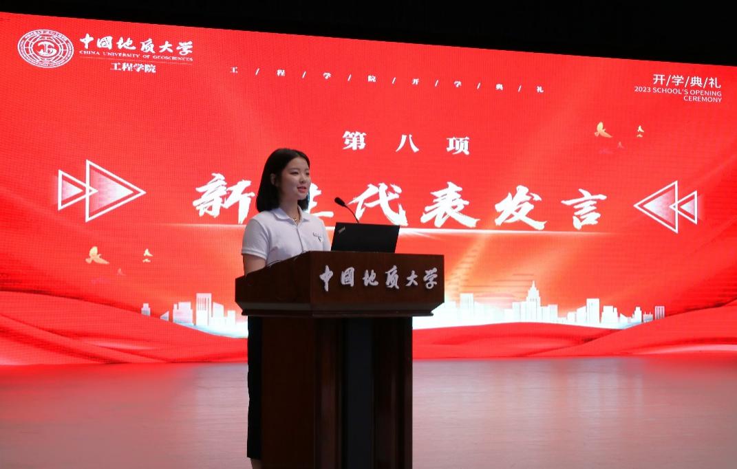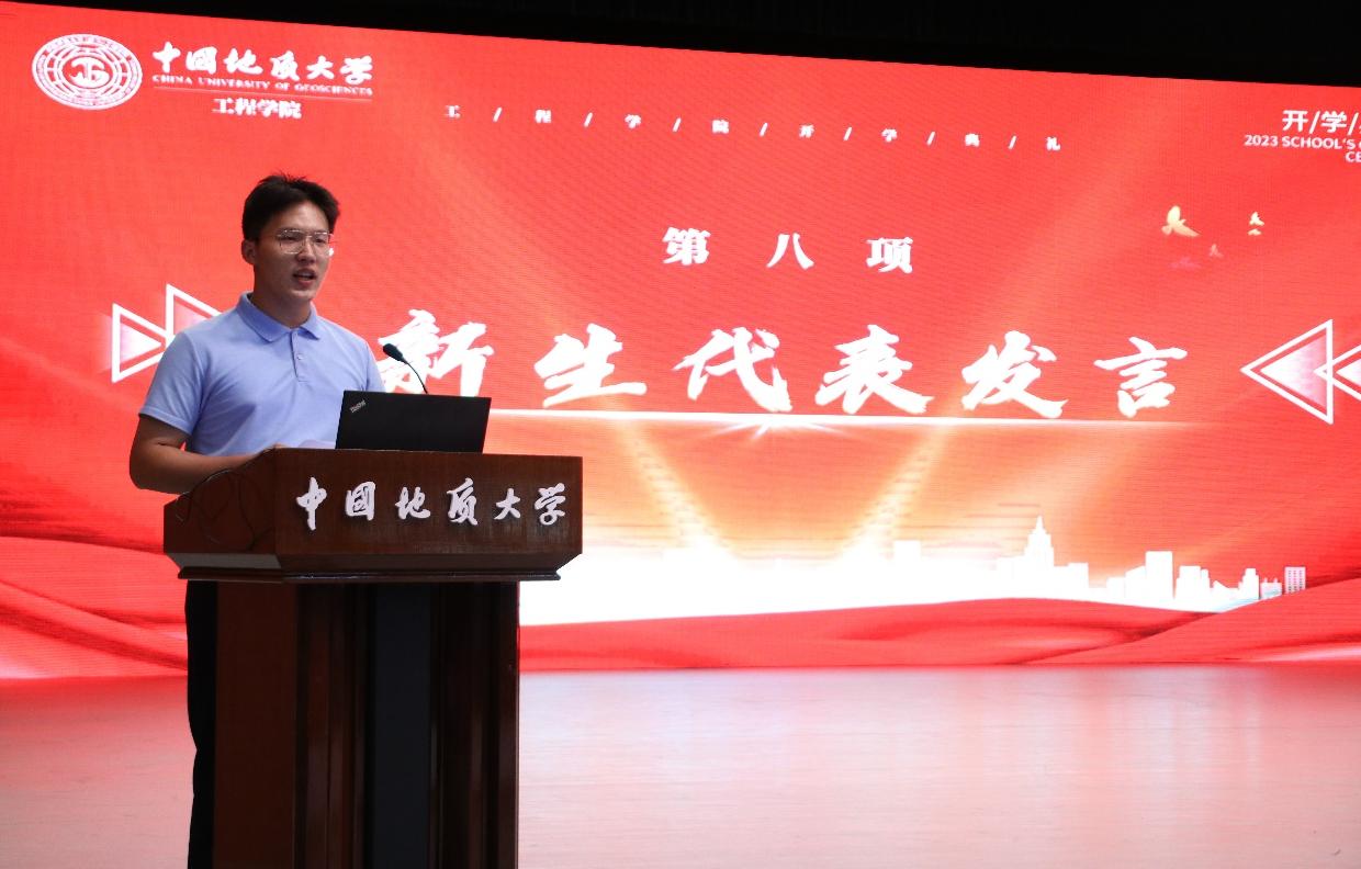 2023级05D231班张高涵同学作为本科生新生代表发言。他说,在长辈厚重岩土气息的熏陶下,自己终于如愿考进地质大学,加入betway西汉姆联平台。他对开学报到以来公司领导老师给予的教育关怀表示感谢,对军事训练当中空军预警公司教官对自己坚忍毅力和良好作息的打造由衷感激,他立志与其他505名本科新生同学一道,以强国建设、民族复兴的时代号召为号角,以“品德高尚、基础厚实、专业精深、知行合一”的成才目标为向导,直挂云帆,乘风破浪,早日成为德智体美劳全面发展的中国特色社会主义事业的建设者和接班人。