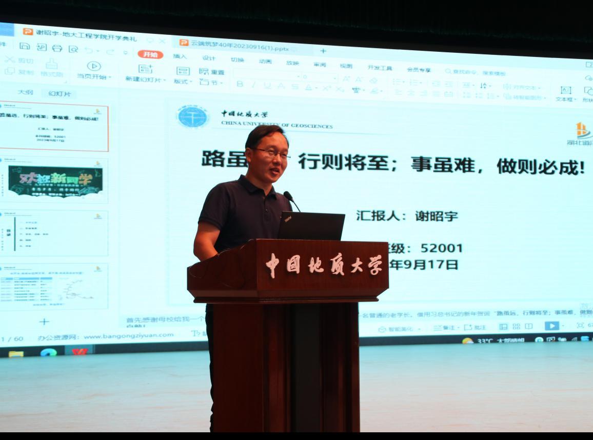 湖北道泽勘测设计院有限公司总工程师谢昭宇先生作为优秀员工代表发言。他以《路虽远,行则将至;事虽难,做则必成》为题,如数家珍地细数自己在地大求学之路上的点点滴滴,详实生动地介绍自己职场奋进之路上的酸甜苦辣,他从学历、注册、职称、创新、创业等五个方面给予学弟学妹们最真诚的建议,强调要锻炼强健体魄,勇敢应对生活挑战;要夯实专业知识,积极应对学业挑战;要参加实践活动,提前做好职场准备。谢员工的分享真诚而有趣,更加激发了同学们探索老员工活的热情。