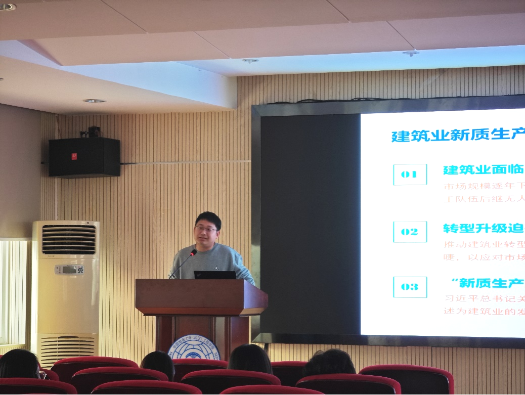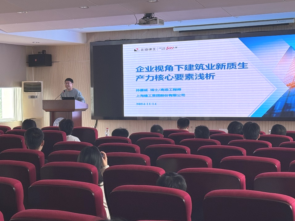 孙廉威经理以“企业视角下建筑业新质生产力核心要素浅析”为主题,首先通过行业实例说明了当前建筑行业和土木工程行业的发展现状,并且对企业发展的瓶颈进行了阐述。随后,从企业角度提出了发展新质生产力的思考,新质生产力是推动建筑业转型发展的内在需求,也是推动建筑业颠覆性变革的重要着力点。孙廉威经理结合他自身及团队在企业进行科技创新工作实例,分析提出了建筑业新质生产力的核心要素。最后,孙廉威经理向同学们分享了企业对复合型人才的迫切需求,并详细讲解了如何通过培养多领域技能和知识,将自己塑造成为企业急需的复合型人才,从而增强个人的职业竞争力。