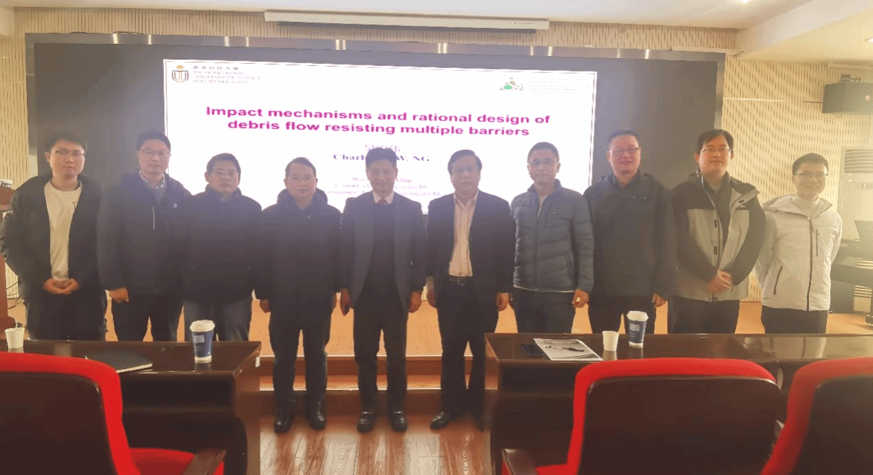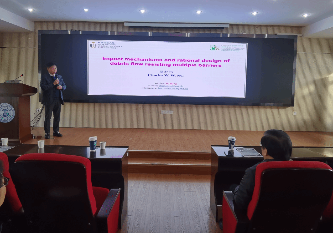 吴宏伟教授作了题为“Impact mechanisms and rational design of debris flow resisting mutltiple barriers”的学术讲座。吴宏伟教授首先介绍了香港科技大学的学科发展历史及国际排名等相关情况,欢迎公司同学前往香港科技大学进行联合培养,开展学术交流活动。随后,介绍其团队近年来在泥石流刚性和柔性屏障设计方面的水槽模型测试和数值模拟试验成果,揭示了典型泥石流对多重屏障的影响机制,为泥石流多重屏障设计提出合理建议。