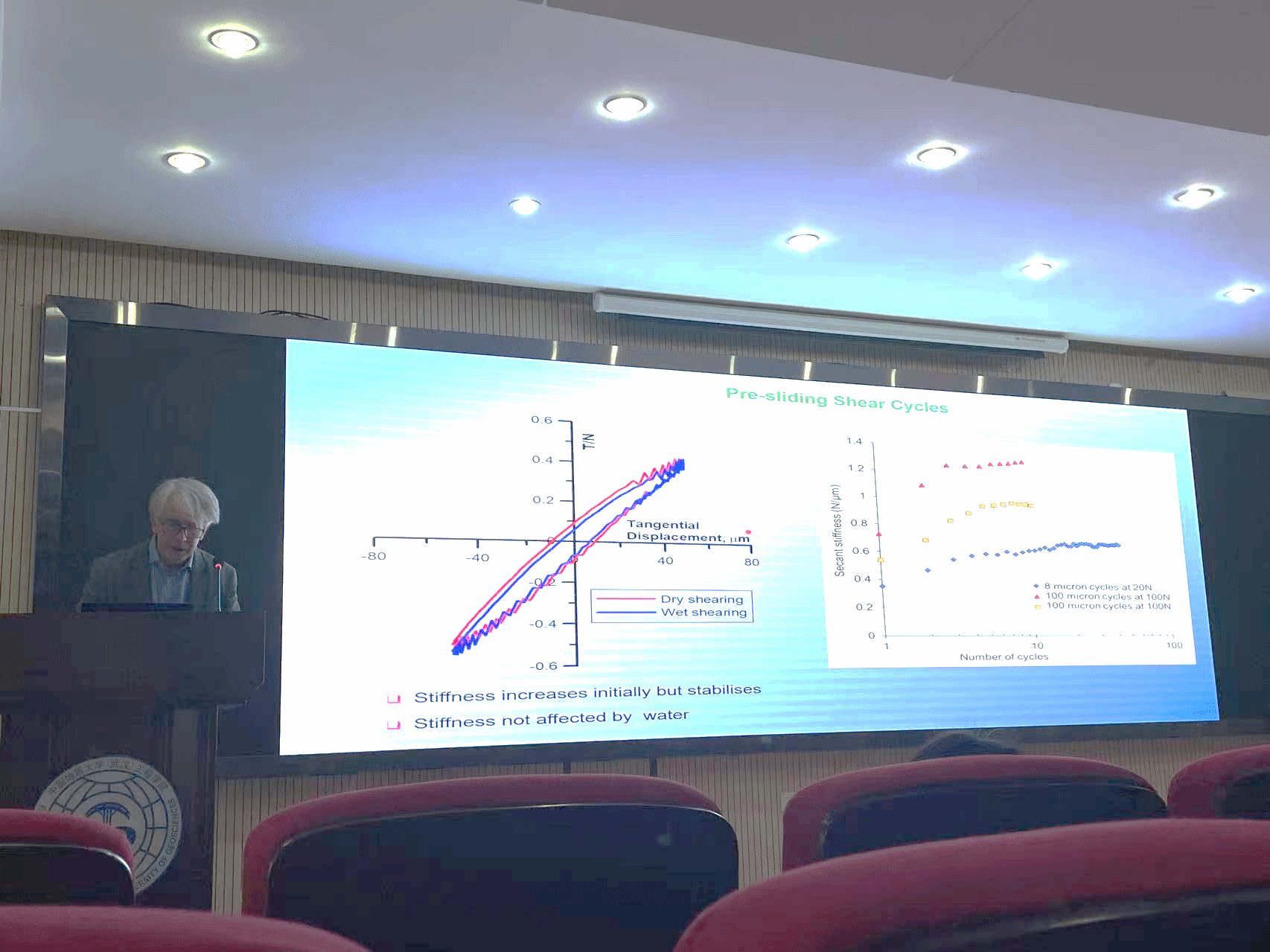 随后,Matthew Coop教授作了题为“From Continuum to Discrete Mechanics in Railway Ballasts”的报告。他指出,对于铁路道砟等粗粒材料,传统的连续介质方法受限于试验技术的挑战,尤其是在精确测定小应变行为方面存在困难。为此,他介绍了一系列新型试验装置和技术,能够在三轴试验中准确测定道砟的小应变刚度,并开展高精度的颗粒接触试验。研究表明,颗粒接触行为受表面粗糙度及凸起接触点影响,塑性变形和颗粒磨损会显著改变接触特性,进而主导连续尺度刚度随应变的衰减。因此,依赖宏观试验校准的简单线性或弹性离散元模型难以准确反映真实接触行为,而应直接基于颗粒接触特性建立合理的本构关系。