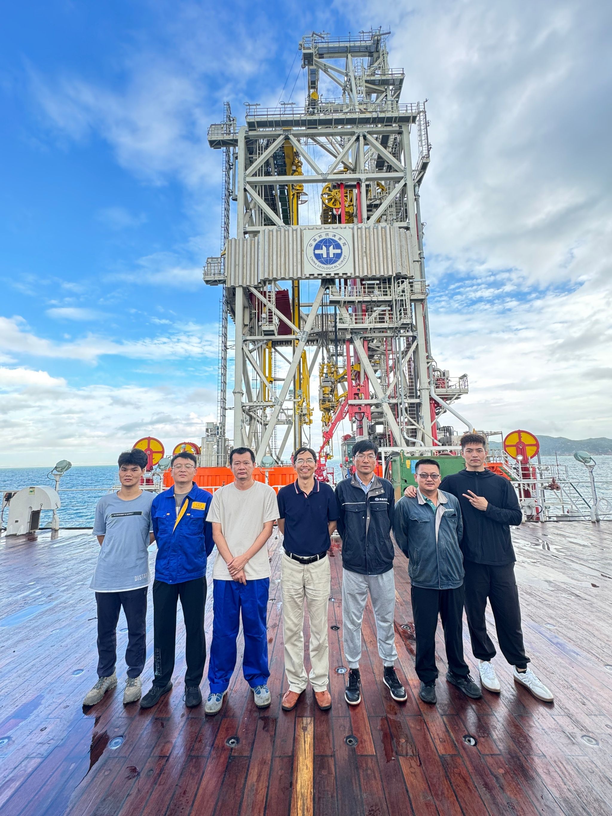 宁伏龙教授(中)带领团队参加“梦想”号钻探船海试工作