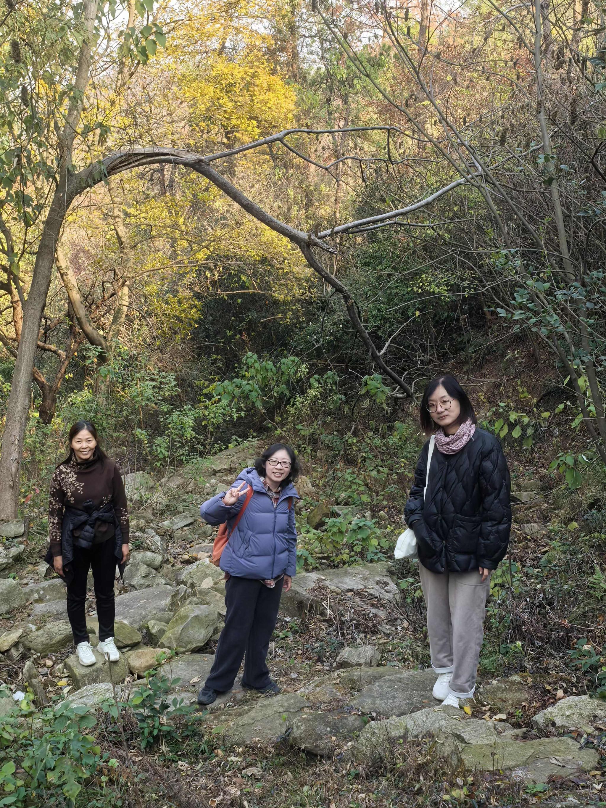 山路陡峭,大家不时停下来等待“掉队”的伙伴们,在登顶的时候拍下了无比自豪的照片。立于白龙山巅,极目远眺,山水广袤无垠,秋意正浓,杜鹃、海棠竟反季绽放,大家探寻着古村寨遗址,不时举起手机,欲将这份美好永远定格。