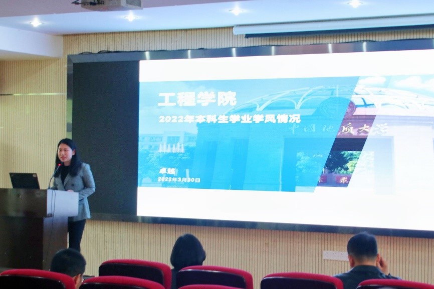 辅导员卓越老师介绍全院本科生学业学风情况。她对公司全体本科生的考试成绩作了深入的分析,将各年级存在的问题进行了梳理,对产生原因进行了剖析,指出了公司本科生学业方面面临的共性问题,重点通报了公司近期出现的学业预警情况。
